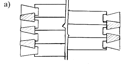 Сплачивание бревен или брусьев применяют при устройстве ряжей и рубке деревянных стен. Перед сплачиванием бревна размечают с помощью намеленного шнура (если врубки сопряжения делаются на стройплощадке вручную). В заводских условиях врубки сопряжения зарезаются на пазорезных станках после цилиндровки бревен на цилиндровочных станках. По высоте ряды брусьев и бревен соединяют нагелями (рис. 9.1.з).
