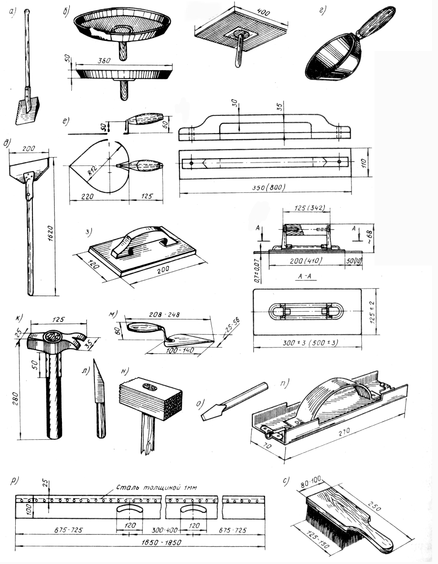 г – ковш; д – скребок; е – штукатурная кельма (лопатка); ж- деревянный полутерок; з – терка деревянная; и гладилка; к – молоток штукатурный; л – нож; м – отрезовка;