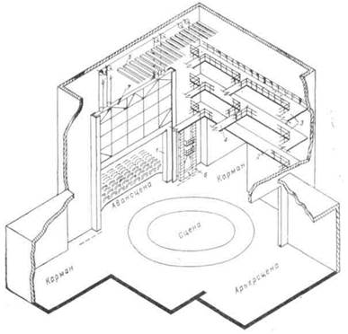 1 — строительный портал; 2 — осветительная галерея; 3 — рабочая галерея; — переходный мостик; 5 — колосники; 6 — портальная башня; 7 — огнестойкий занавес