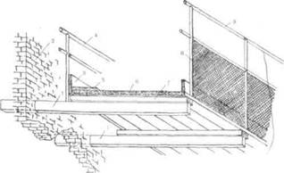 | Рис. 4. Галерея сцены: 1 — консольная балка; 2 — боковая стена сцены; 3 — приборто-вая доска; 4 — внутреннее ограждение; 5 —усиленная часть настила; 6 — настил; 7 —деревянная лага; S —сетка; 9 — внешнее ограждение |