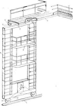 В театральной практике встречается два типа портальных башен. К первому типу относятся многоэтажные, башенные сооружения толщиной 0,8—0,9 м. На каждом этаже расположена световая аппаратура. Второй тип, наиболее распространенный, более похож на усиленную кулису (рис. 5). Каркас этой башни имеет толщину всего 140 мм. К его внутренней стороне прикрепляются осветительные мостики, расположенные один над другим. Мостики занимают только среднюю часть башни, оставляя место для вертикальных лестниц, идущих по обеим