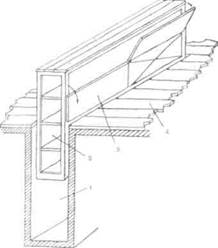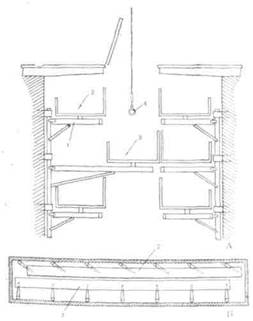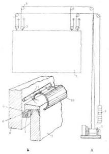 ¶Транспортировка и укладка скаток на полки весьма трудоемкая и небезопасная операция. Поэтому механизации загрузки и разгрузки сейфов придается большое значение. Одним из интересных способов механизации сейфов является система подвижных полок, сконструированная и осуществленная впервые в Ленинградском академическом театре оперы и балета им. С. М. Кирова в 1954 году (рис. 7).