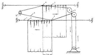 1 — несущий трос; 2 — кольцо занавеса; 3 — тяговый канат; 4 —