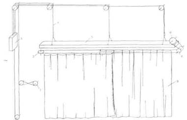 1 — электролебедка штанкетного подъема; 2 — обводной блок дороги; 3 — противовес; 4 — несущий трос; 5 — дорога занавеса; 6 — электролебедка занавеса; 7 — тяговый трос; 8 — направляющий блок; 9 — занавес