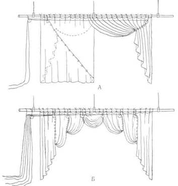 ¶Рис. 46. Эффектный занавес: а — переворачивающийся занавес из отдельных полотнищ; б — то же, сшитый целиком
