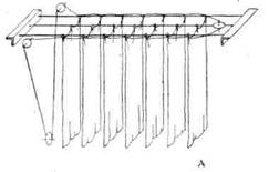 Фигурные занавесы подъемного типа строятся по принципу французской шторы. К обратной стороне занавеса пришиваются вертикальные ряды колец (рис. 45б). Через них пропускаются веревки, прикрепленные к нижней кромке и пропущенные через блоки подвесной фермы или штанкета. Рисунок раскрытия зависит от последовательности натяжения тяговых шнуров. В открытом виде фигурный занавес обрамляет сцену разнообразными фестонами.