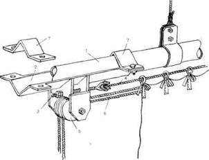 | Рис. 47. Тросовая дорога-раздержка (вместо фермы здесь используется штанкет декорационного подъема): 1 — штанкет; 2 — уголок; 3 —натяжной болт; 4 — трос; 5—направляющий блок; 6 — приводной канат; 7 — хомут |