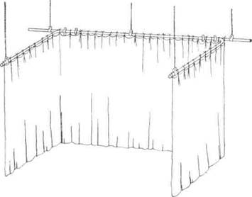 Подвеска мягкого горизонта подъемно-опускного типа возможна к любому штанкет-ному подъему. В самом элементарном варианте к декорационному штанкету на определенном расстоянии друг от друга крепятся две изогнутые трубы, наружные концы которых поддерживаются веревками ручных подъемов, пропущенных через¶колосниковые блоки. Полотно горизонта привязывается к штанкету и боковым трубам. При натяжении веревок боковые трубы принимают горизонтальное положение, раскрывая горизонт (рис. 50). Сильная и равномерная натяжка полотна достигается применением второго изогнутого штанкета, прикрепляемого к обратной стороне горизонта на высоте 20—25 см от планшета.
