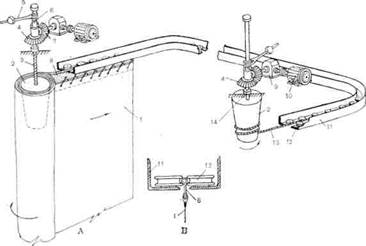 ¶кальным перемещением барабана при его вращении. Скорость опускания барабана при намотке рассчитывается таким образом, чтобы за один оборот барабан переместился на толщину каната. В верхнем положении барабана его нижняя часть находится на оси дороги, а горизонт полностью размотан. Канато-емкость барабана зависит от длины горизонта: за один ход от верхнего до нижнего положения полотно горизонта должно быть полностью намотано на барабан.