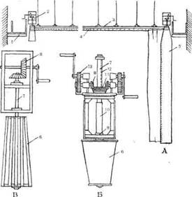 Принцип передвижного горизонта заключается в наматывании полотна на вертикально подвешенный барабан. Механизм горизонта состоит из дороги и двух приводных барабанов (рис. 51). Дорога служит для передвижения и закрепления горизонта в рабочем положении. Ее форма и длина определяется формой и размерами горизонтного полотна.