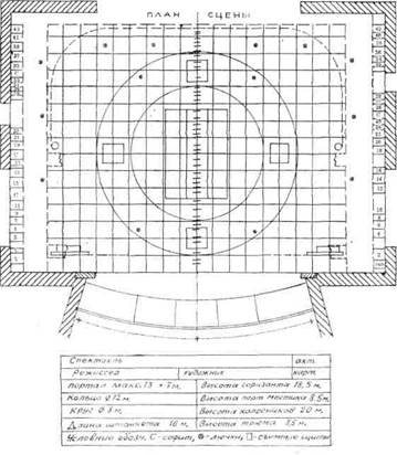 Наилучшим масштабом для плана и разреза сцены является 1:20. Большинство театров избегает слишком больших листов, сокращая этот масштаб до 1:50. Однако с уменьшением величины чертежа теряется его точность. Чтобы избежать ошибок из-за мелкого масштаба, помимо общей планировки изготавливается план игровой части сцены в стандартном для театра масштабе 1:20.