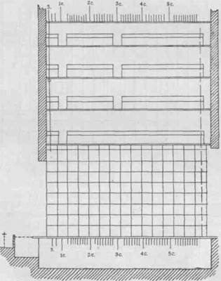 ¶Вертикальный разрез сцены делается по ее продольной оси. Разрез охватывает всю высоту сцены от низа трюма до колосников, арьерсцену, оркестровую яму в ее полном сечении, выносной софит и т. д. На разрезе показываются переходные мостики, галереи, штанкеты, софиты, горизонт, круг, занавес и другие виды оборудования (рис. 119). Для определения высоты декораций и одежды сцены необходима отметка, находящаяся на уровне глаз человека, сидящего в первом ряду партера. Эта точка находится на расстоянии 115—120 см от пола.
