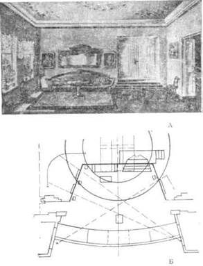 | Рис. 120. «Женитьба>, комедия Н. В. Гоголя. Худ. Н. Акимов; а — эскиз декорации; б — планировка декорации |