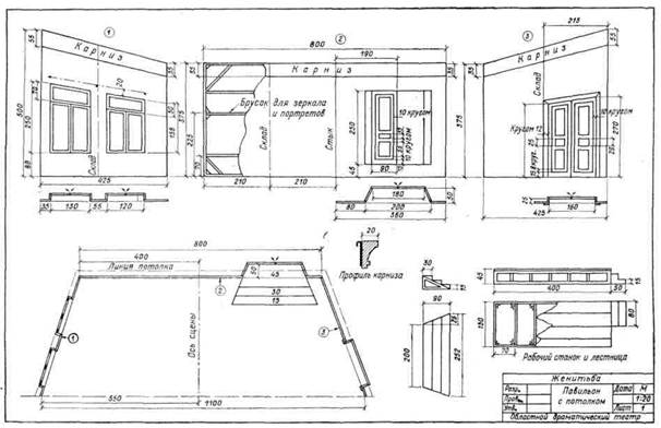 При вычерчивании павильона в нижней части листа располагается его план, а в верхней — развертка всех стен (рис. 121). План необходим для того, чтобы при изготовлении павильона и его монтировке в мастерской было ясно, под каким углом соединяются отдельные стенки, каким образом на них поставить крепления. В простых павильонах, где нет большого количества дверных и оконных проемов, арок и прочих элементов архитектуры, дается сплошная развертка стенок. Места стыков обозначаются сплошной линией, а складов — пунктирной. В более сложных случаях между отдельными стенками оставляется разрыв для размерных линий и боковых продольных разрезов. Все стенки как на плане, так и на фасадной развертке пронумеровываются по единой системе.