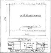 В правом углу помещается штамп, где предусматриваются графы для наименования театра, названия спектакля, акта, картины и изображенной декорации. Здесь же проставляется масштаб и дата выполнения чертежа. Готовый чертеж утверждает своей подписью художник спектакля, а заведующий художественно-постановочной частью визирует его к исполнению.