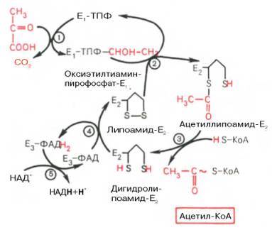 Окисление пирувата до ацетил-КоА происходит при участии ряда ферментов и коферментов, объединенных структурно в мультиферментную систему, получившую название «пируватдегидрогеназный комплекс».