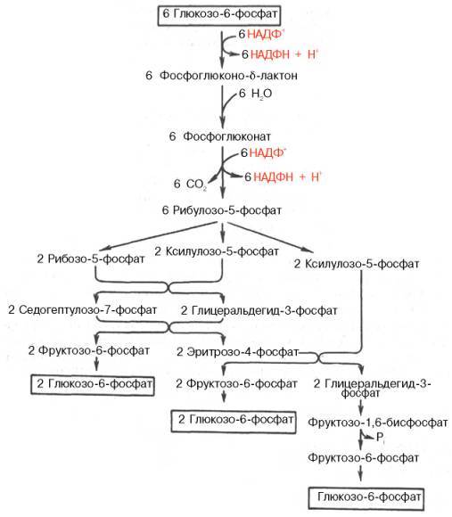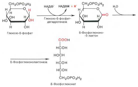 Первая реакция – дегидрирование глюкозо-6-фосфата при участии фермента глюкозо-6-фосфатдегидрогеназы и кофермента НАДФ+. Образовавшийся в ходе реакции 6-фосфоглюконо-δ-лактон – соединение нестабильное и с большой скоростью гидролизуется либо спонтанно, либо с помощью фермента 6-фосфоглюконолактоназы с образованием 6-фос-фоглюконовой кислоты (6-фосфоглюконат):
