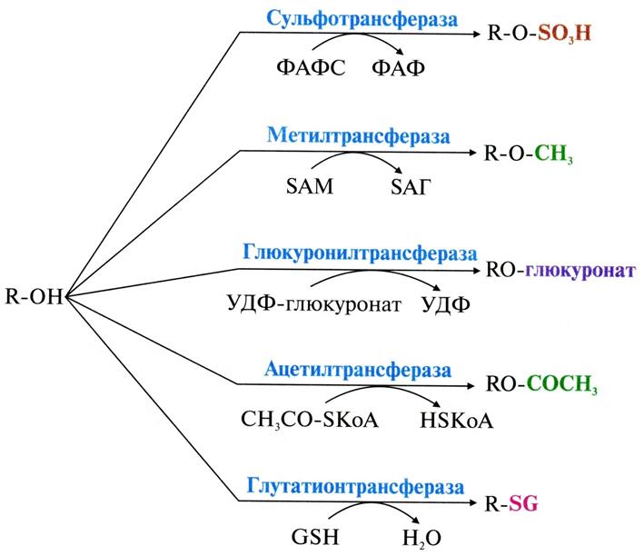 Донором CH3– группы является SAM, группы –SO3H – активная форма серной кислоты (ФАФС), ацетильной группы – ацетил-КоА, остатка глюкуроновой кислоты – УДФ-глюкуронат.