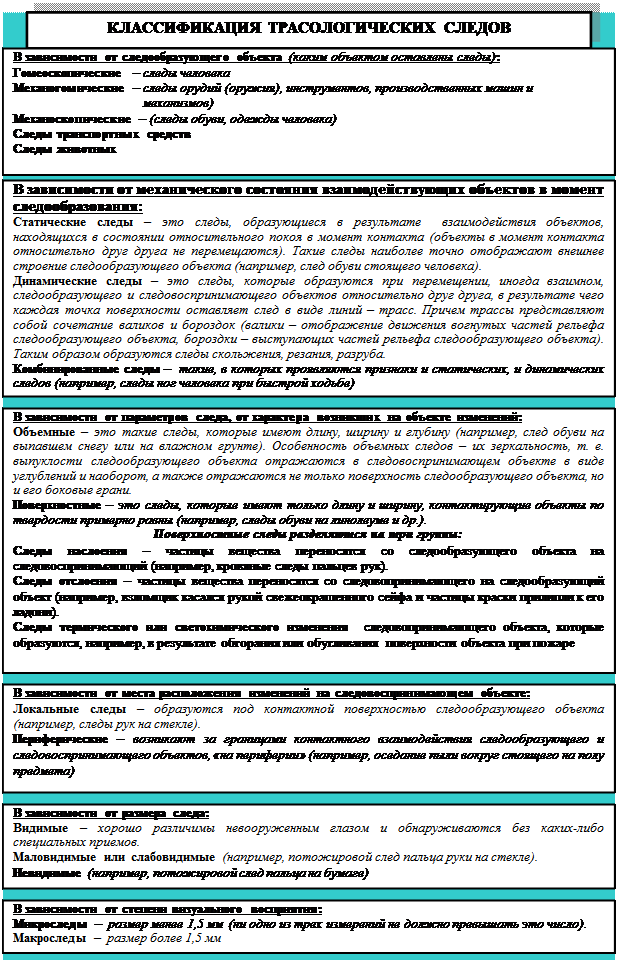 Трасология (от фр. la trace – след и греч. logos – учение) – это отрасль криминалистической техники, изучающая закономерности образования следов-отбражений, а также следов-предметов и следов-веществ, отображающих следовую картину события, и разрабатывающая научно-технические средства, приемы и методы обнаружения, фиксации, изъятия и исследования их с целью раскрытия, расследования преступлений и установления обстоятельств, способствующих их совершению.