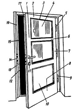 | | | ДВЕРЬ 1 – передний брусок обвязки 2 – верхний брусок обвязки 3 – рамка филенки 4 – верхняя филенка 5 – верхняя петля 6 – горизонтальный средник 7 – задний брусок обвязки 8 – нижний брусок обвязки 9 – нижняя петля 10 – нижняя филенка 11 – замочная скважина 12 – ригель 13 – защелка 14 – запорная планка 15 – четверть дверной коробки 16 – ребро переднего бруса обвязки | |