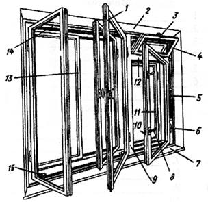 | | | ОКОННЫЙ БЛОК(трехстворчатый) 1 – щелевая накладка 2 – внутренний откос оконного проема 3 – фиксатор фрамуги 4 – обвязка рамы фрамуги 5 – уплотнитель 6 – оконная петля 7 – подоконная доска 8 – рукоятка запорного устройства 9 – промежуточная обвязка оконной коробки 10 – нижняя обвязка наружной рамы 11 – боковая обвязка наружной рамы 12 – промежуточная обвязка оконной рамы 13 – боковая обвязка внешней рамы 14 – оконная коробка 15 – фиксатор | |
