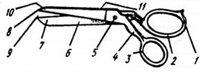 | НОЖНИЦЫ 1 – выступ кольца 2 – большое кольцо 3 – малое кольцо 4 – ручка 5 – осевой винт 6 – бранша 7 – широкое лезвие 8 – резец (режущая кромка) лезвия 9 – острие лезвия 10 – узкое лезвие 11– полозок | |