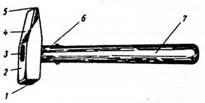 | | | МОЛОТОК 1 – квадратный боек 2 – торцевая часть 3 – головка ручки 4 – скос 5 – носок 6 – металлическая накладка 7 – ручка | |