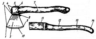 | | | | ТОПОР 1 – носок 2 – шейка клинка 3 – клин 4 – головка 5 – обух 6 – боковая стенка головки 7 – топорище 8 – бородка 9 – пятка 10 – лезвие клинка 11 – закрепительная часть 12 – средняя часть 13 – захватная часть 14 – хвост | |