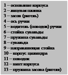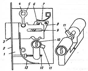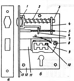 | | | | а – запорная планка б – замок 1– ролик фиксатора 2 – пружина 3 – вилка 4 – упорная планка 5 – регулировочный винт 6 – регулировочная планка (гайка винта) 7 – пружина сувальды 8 – ось сувальды 9 – сувальда 10 – стойка ригеля (засова) 11 – ригель (засов) 12 – основание корпуса 13 – лицевая планка | |