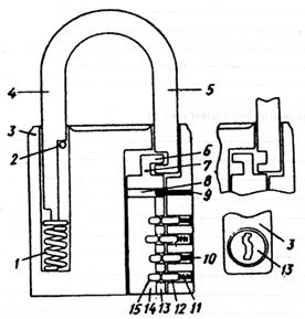 | | | 1 – пружина дужки 2 – ограничительный штифт дужки 3 – корпус 4 – свободный конец дужки 5 – запираемый конец дужки 6 – головка засова (ригеля) 7 – хвостовик (шейка) засова (ригеля) 8 – паз для упорного штифта 9 – упорный штифт цилиндра 10 – заглушка 12 – штифт корпуса 13 – цилиндр 14 – скважина для ключа 15 – штифт цилиндра | |