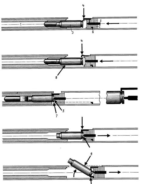 | 1 – ствол 2 – затвор 3 – патрон | 4– выбрасыватель 5 – ударник 6 – отражатель | 7 – капсюль 8 – ребро патронника 9 – окно выбрасывания |
