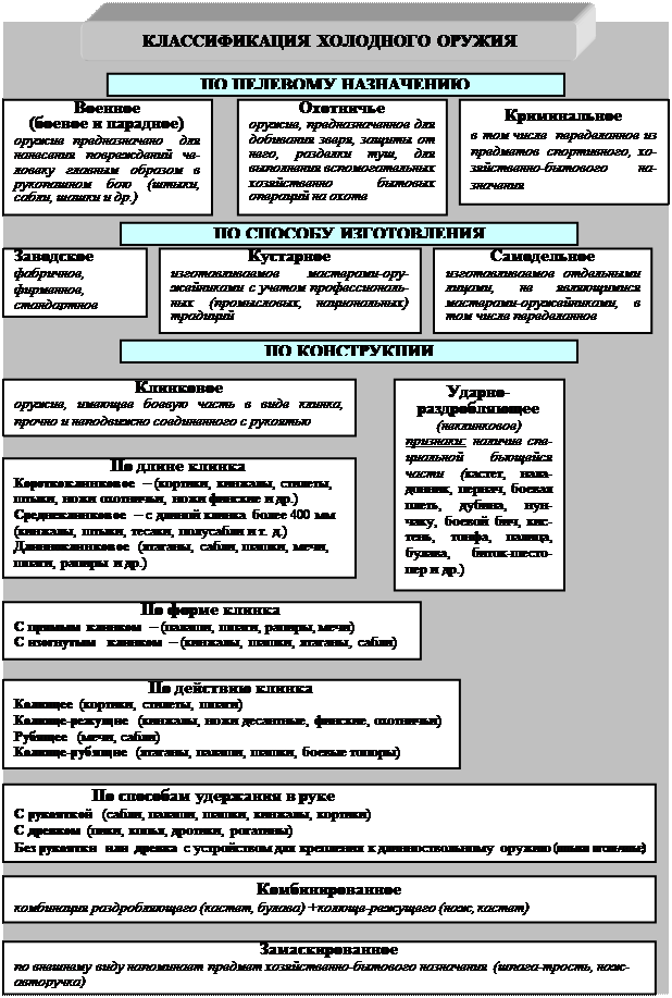 В настоящее время криминалистами в основном используется разветвленная классификация холодного оружия, составленная В. М. Плескачевским, Е. Н. Тихоновым.