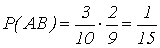 Но Р(А)=3/10; РA(В)=2/9, поскольку после того, как был вынут первый белый шар, в урне осталось 9 шаров, из которых 2 белых. Следовательно,