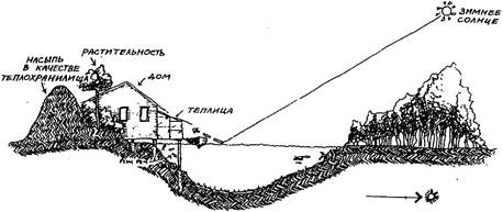 При планировке участка надо также принять во внимание тот факт, что вода отражает солнечную световую энергию. Несмотря на то что рассеянный свет, отражаемый водой, не распространяется на большое расстояние, в случае прямого отражения в зимнее время (когда солнце стоит низко над горизонтом) свет может проделывать довольно большой путь. В долине Мэйн (Германия) отраженный от воды солнечный свет используется для того, чтобы ускорить созревание винограда, растущего на прилегающем к реке склоне. Следовательно, обращенные к солнцу берега рек или возвышенности, находящиеся за водоемами, можно рассматривать как места наиболее благоприятные для размещения нежных видов, требующих большего количества тепла и света. Дома, расположенные на таких берегах или на земляных насыпях возле водоемов, получают дополнительное количество солнечной энергии (рис. 2.8).