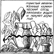 Растения в своих листьях преобразуют воду в испарения, которые затем отдают окружающему воздуху. Этот процесс требует определенного количества энергии, что вызывает охлаждение воздуха вокруг растения (точно так же, как при выделении пота у животных). Одновременно с падением температуры увеличивается влажность. Для того чтобы этот процесс протекал должным образом, необходимо наличие достаточного количества влаги. Многие народы, которые живут в засушливых регионах, выработали собственные способы, для того чтобы сделать воздух на небольшой площади возле дома более прохладным. Островитяне на Канарах используют большие глиняные кувшины, наполненные водой и покрытые дерюгой, которые устанавливаются в густо засаженных растительностью дворах для того, чтобы понизить температуру в прилегающем пространстве (рис. 2.11).