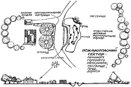 ♦ Создание специальных экранов, защищающих от воздействия теплового излучения, включая: а)раэмещение невозгораемых сооружений (пруды, земляные насыпи, каменные стены); б)посадки огнестойкой растительности (лилия, ко-прозма, ива), которая, хотя и может быть уничтожена огнем, но все же замедлит его дальнейшее продвижение (рис. 2.31).
