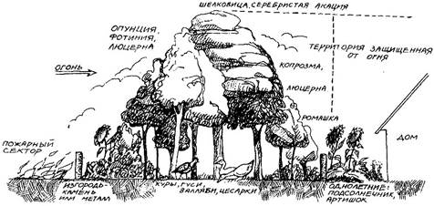 ♦ Уменьшение количества горючих материалов в пожароопасном секторе путем: а)соответствующего ухода за нижним ярусом леса (уборка растительного мусора и сухих деревьев, которые затем можно использовать в качестве дров); б)подстригания травы или использования для этой цели животных, питающихся травой (гуси, валляби) и не дающих ей высоко подняться; в)размещения между пожароопасным сектором и жилищем невозгораемых элементов, таких, как дороги, пруды, плотины, участки, полностью покрытые зеленой мульчей или засеянные культурой, стойкой к возгоранию (зеленой культурой).