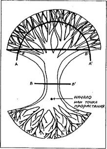 Через всю эту книгу мы стараемся пронести идею применения паттернов для организации пространства, потому что как и сам дизайн, так и все его отдельные компоненты должны находиться в рамках определенного шаблона или паттерна, основанного, в свою очередь, на здравом смысле. Чтобы понять основной паттерн, в рамках которого находятся все природные явления, давайте нарисуем различные сечения дерева (включая корни, крону и ствол). С помощью этой нехитрой схемы можно понять законы течения (движение соков в дереве), законы формы, роста и распространения. Модель дерева в данном случае очень удобна, ибо она является типичной для всех природных явлений (рис. 3.1).