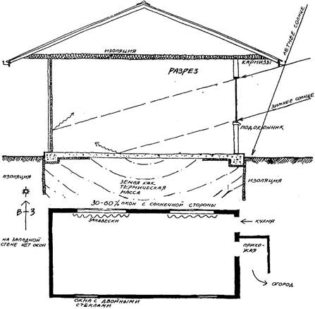Рисунок 4.6 Окна и карнизы располагаются таким образом, чтобы зимой солнце проникало в дом, а летом нет. Пол цементный, земля под ним теплоизолирована со стороны фундамента, а окна на теневой стороне двойные.