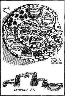В травяной спирали (рис. 5.1) на холмике земли с основанием шириной 1,6 м, поднимающемся на высоту от 1,0 до 1,3 м, умещаются все основные кулинарные травы. Здесь присутствуют различные условия в плане дренажа и освещенности, что дает возможность использовать солнечные сухие места для таких богатых маслами трав, как тимьян, шалфей, розмарин; и влажные или затененные места для листовой зелени, такой, как мята, петрушка, шнитт-лук и кориандр. Внизу спирали находится небольшой выстланный пленкой пруд, в котором можно выращивать жерушник или орех водяной. Травяную спираль удобно поливать одним дождевальным аппаратом, установленным наверху.