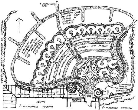 Рисунок 5.10. Идеализированная схема кухонного огорода для зоны с умеренным климатом. Обеспечивается полноценный набор продуктов и соответствующий микроклимат в доме. В число компонентов включены компостная яма, содержание которой не требует высоких затрат (возле лимона), шпалерная культура и травяная спираль.