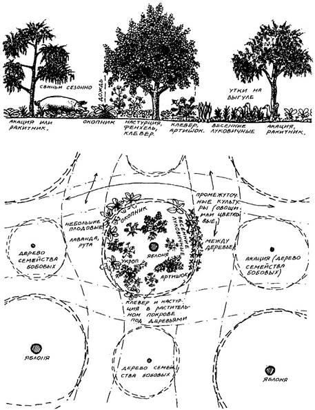 Рисунок 6.2. Идеализированная схема организации биологического сообщества в яблоневом саду. Деревья из семейства бобовых используются для получения мульчи; многолетние и однолетние цветковые растения приносят пользу в борьбе с насекомыми-вредителями; окопник и другие травы замедляют распространение сорняков.