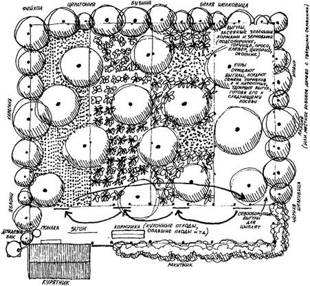 Эта система, описанная в информационном буклете Робина Френсиса «Куры на пермакультурном огороде», дает корм для 6 - 8 кур-несушек, а также обеспечивает семью значительным количеством фруктов.