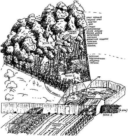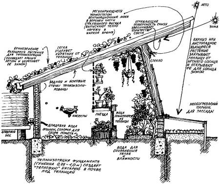 На рис. 7.8 показана обогреваемая курами теплица, которая является примером саморегулирующегося искусственного сооружения. Зимой теплица посредством вентиляционных люков обогревает помещение для кур (а тепло от куриных тел поддерживает нормальную температуру в теплице), тогда как летом вентиляционные люки закрыты, и куры проводят большую часть времени снаружи, в поисках корма. Оба помещения отделены друг от друга металлической сеткой, но при этом между ними имеется дверь или люк, позволяющий собирать яйца из гнезд и кормить кур зеленью, выращенной в теплице. Куры дают для теплицы двуокись углерода, перьевую пыль и помет с подстилкой, которые сразу же идут на приготовление компоста.