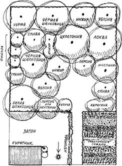 Рисунок 7.7. Посадка на заднем дворе, обеспечивающая кур кормом (средиземноморский тип климата).