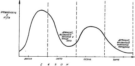 Рисунок 7.14. Кривая роста трав в зависимости от времени года (в умеренном климате). На графике показаны два периода дефицита: зима и конец лета.