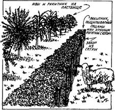 Традиционно для того, чтобы стадо могло пережить засуху, измельчали и давали в корм листву брахихитона (Brachychiton populneum), ивы плакучей и тополя. Для создания систем, которые могли бы обеспечить самостоятельное кормление в "кормовой роще", сажают полосы древесных видов с низкорасположенной листвой, куда можно выгонять стада на короткие периоды времени. Защищенные металлической сеткой живые изгороди из ракитника использовались с большим успехом в Новой Зеландии. Коровы и овцы при этом не повреждают растения, но ощипывают прирост сочных листьев через сетку. Животных необходимо выпускать на участок приблизительно один раз в месяц во время роста растений (рис. 7.15).