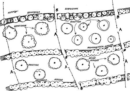 Для того чтобы устроить окружающие живые изгороди, подсевают и сажают люцерну, окопник, цикорий, одуванчик, в качестве среднего яруса - ракитник, кара-гану высокую, копросму ползучую или пампасную траву, а в качестве высокого яруса помещают иву, тополь (специально отобранные высокоценные кормовые сорта), дуб белый, каштан, гледичию трехко-лючковую и предпочитаемый животными веточный корм (виды боярышника и Rosa). Эти посадки планируются таким образом, чтобы они занимали по 10% площади в год вплоть до наступления четвертого года, когда уже 40% общей площади будет представлять собой широкую, окаймляющую посадку сложной формы, состоящую из глубоко укоренившегося кустарника, а также высоких видов, дающих веточный корм, и даже ценных строевых деревьев (рис. 7.16). Через 4 - 5 лет сюда уже можно будет периодически под наблюдением запускать овец и молодняк коров. Начиная с 6 - 8 годов время общипывания веток можно будет продлить, а в случае крайней необходимости такие виды, как ива и тополь, можно срезать и скармливать животным в период засухи.