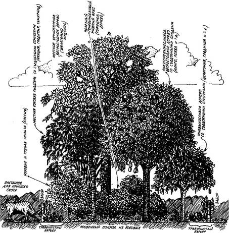 Назначением таких систем, состоящих из пастбищ и кормовых деревьев, является организация постоянного кругооборота питательных веществ от растений к животным и обратно в почву, что осуществляется за счет использования навоза и азотфиксирующих* бобовых видов. Другая цель состоит в том, чтобы обеспечить разнообразие продукции, получаемой на ферме. Древесные продукты, такие, как стручки цератонии и каштаны, можно превращать в сахара, топливо, пищевые добавки, муку и т.д. Это имеет огромное значение, когда ситуация на рынках шерсти, кожи и мяса постоянно меняется, и дает фермеру-лесоводу огромное преимущество перед фермером, верным принципу "только пастбище", который привязан к одному рынку или продукту.
