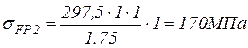 В нашем случае: Ft = 3141,86 Н; mn = 2 мм; b1 = 80 мм; b2 = 72 мм; β = 10˚48´; εα = 1,745; KFα = 0,9; KFβ = 1,05; KFV = 1,03; Yε = 0,65; Yβ = 0,9; YF1 = 3,75; YF2 = 3,59